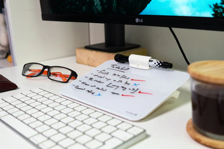 The DeskBoard Buddy Mini's glass panel is 8.25"(21cm) x 6"(15cm) in size, and 1.1lb (0.5kg) in weight. It's small enough to fit on nearly any desk setup, while also large enough to keep your to-do list and meeting notes.