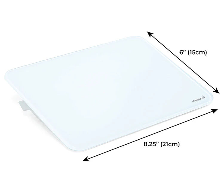 The DeskBoard Buddy Mini's glass white board surface is 8.25"(21cm) x 6"(15cm), giving you plenty of room to keep your daily notes. It can also fit perfectly between your keyboard and computer monitor, or off to the side of your keyboard or laptop. The DeskBoard Buddy Mini weighs approximately 1.1 lbs (0.5 kg).